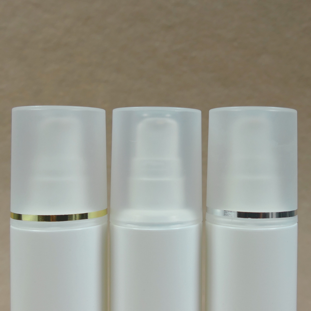 Airless-Dispenser VINCI 30ml / Set besteht aus Unterteil PP weiß mit Innenbeutel natur und Cremepumpe PP weiß und mattierter Überkappe (unmontiert) mit Goldringprägung