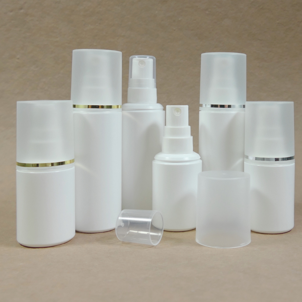 Airless-Spender VINCI 50ml / Set besteht aus Unterteil PP weiß mit Innenbeutel natur und Zerstäuber PP weiß und mattierter Überkappe (unmontiert) mit Goldringprägung